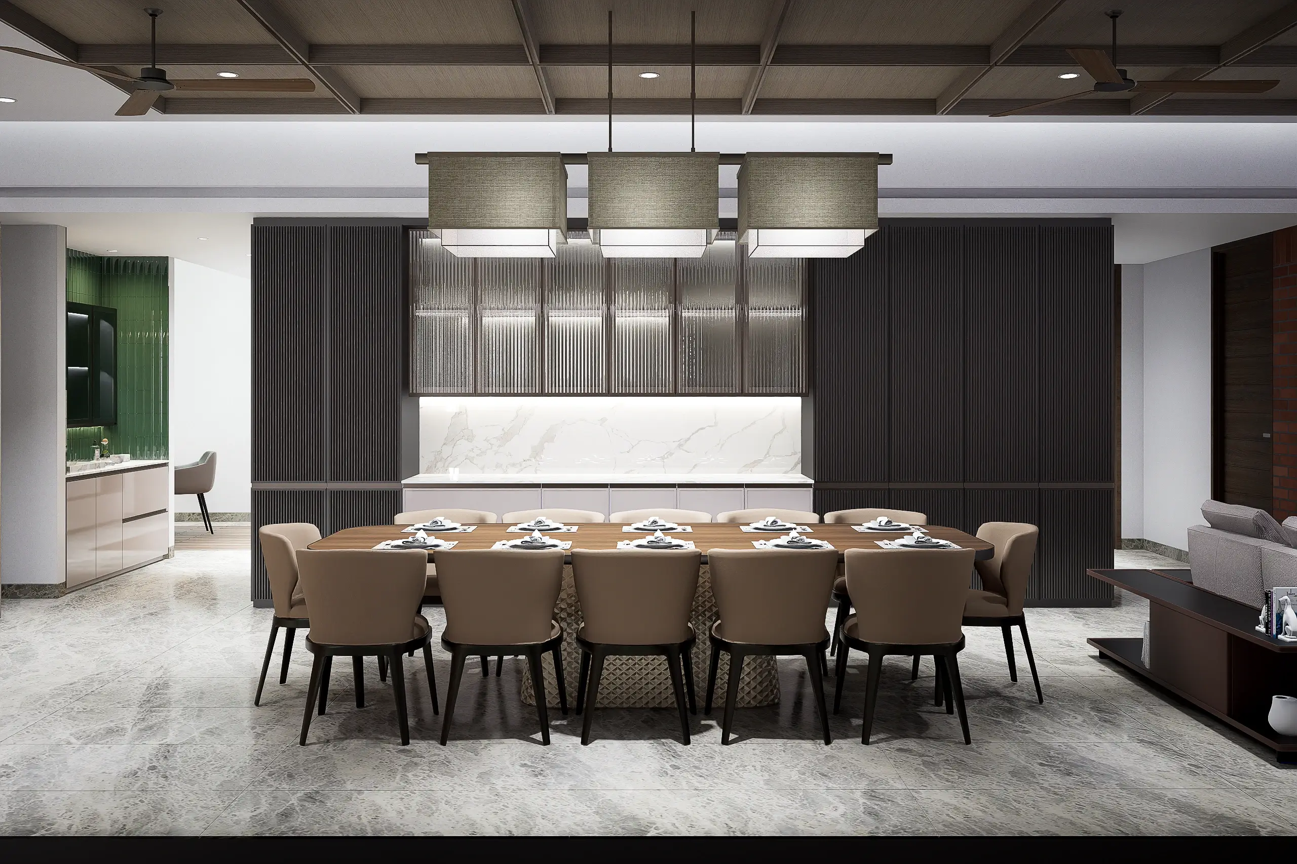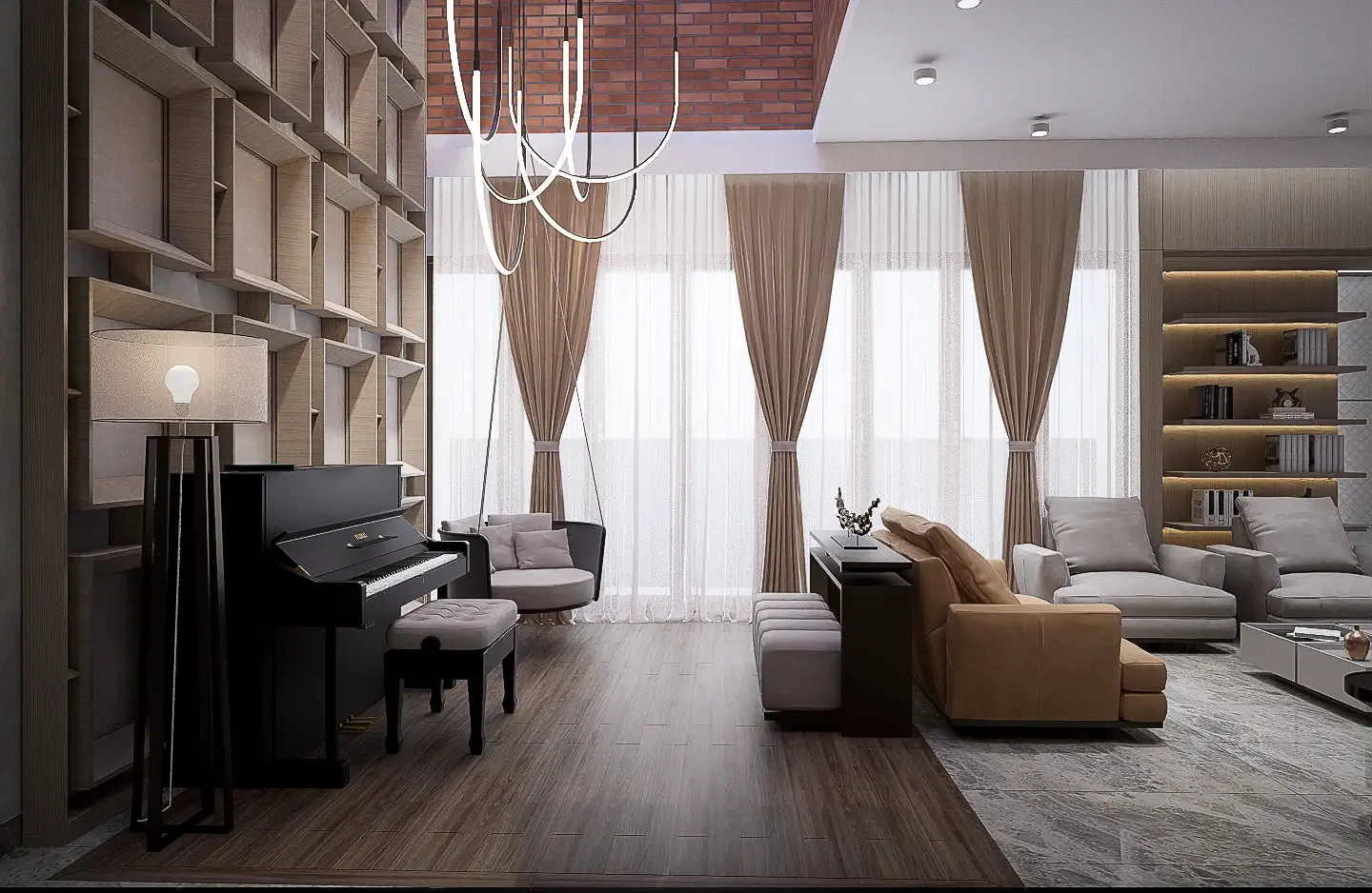 A double-height formal living area serves as the home’s centerpiece, creating a grand yet inviting atmosphere with abundant natural light and open spaces that ensure seamless airflow. Expansive windows and high-quality finish materials further elevate the design, blending sleek aesthetics with functionality.